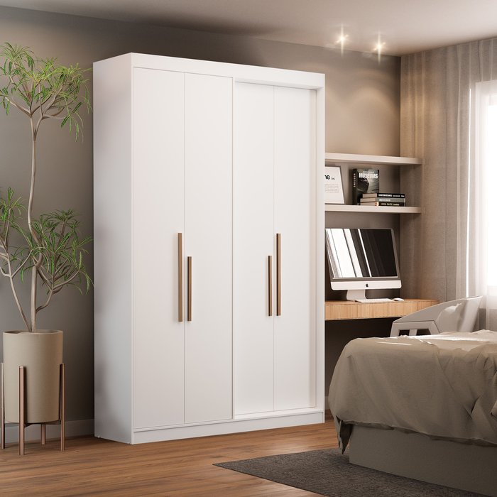O roupeiro Manila 4 Portas de bater possui na sua distribuição interna 2 amplas gavetas de corrediças metálicas. Além de 2 cabideiros de tubo oblongo, proporcionando uma melhor organização interna. Com seu visual contemporâneo possui 2 opções de posicionamento de puxadores, 2 opções de posicionamento de portas e 3 opções de internos diferentes, agregando ainda mais autenticidade para o seu ambiente. Produto 100% MDF com pintura UV garante durabilidade nas cores e texturas sensíveis ao toque.