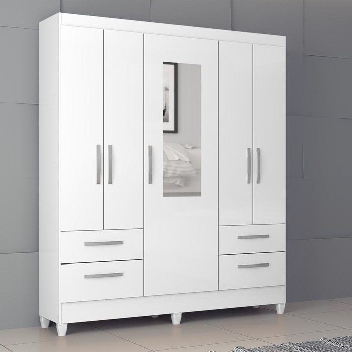 Guarda Roupa Solteiro Armário Roupeiro Cabideiro Quarto 5 Portas Espelho 4 Gavetas Branco Brilho