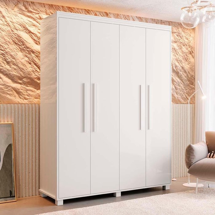 Estrutura Robusta e Durável:- Fabricação em 100% MDF para qualidade e durabilidade excepcionais.- Reforço da base em MDF de 20mm para maior resistência e estabilidade.Armazenamento Prático e Eficiente:- 4 portas, proporcionando fácil acesso a seus pertences.- 2 gavetas com corrediças telescópicas para abertura suave e total visibilidade.- 1 cabideiro em alumínio e 2 prateleiras interna para organizar suas roupas.- 2 maleiros e 4 nichos internos para acomodar objetos de diversos tamanhos.Toque de Elegância e Estilo:- Puxadores em MDF para um acabamento elegante.- Detalhe de encabeçamento de 20mm nas laterais e na base.- Pés em madeira que adicionam um toque de sofisticação ao design.Qualidade nos Detalhes:- Fundo encaixado com pinázio para durabilidade a longo prazo.Dimensões do Produto: Largura 158 cm; Profundidade 55 cm; Altura 226 cm.Itens inclusos: 1 Guarda RoupaComplexidade da montagem: Média, pode ser montado por apenas uma pessoa e/ou necessite de maior conhecimento para montagem.Recomendações de uso, manutenção e limpeza: Limpar com flanela ou pano macio seco, não utilizar produtos abrasivos, desengordurantes, álcool ou solvente. Não expor o produto diretamente a luz solar e à umidadeGarantia: 3 mesesOBS: Foto meramente ilustrativa, objetos, utensílios e decoração não fazem parte do produto.Manual de Montagem e Instalação