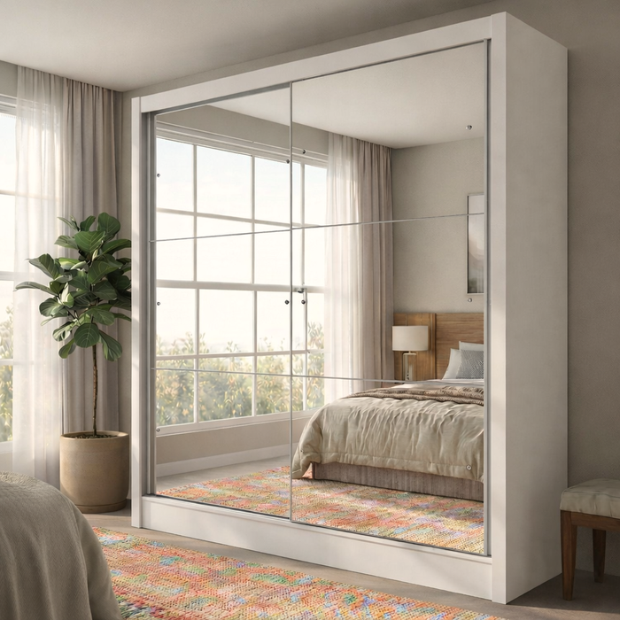 - Design Moderno com Espelhos: Suas 2 portas de correr são totalmente revestidas com 6 espelhos, que dão a sensação de um quarto mais amplo e iluminado. Os puxadores em perfil de alumínio percorrem toda a altura das portas, criando um visual limpo e sofisticado.