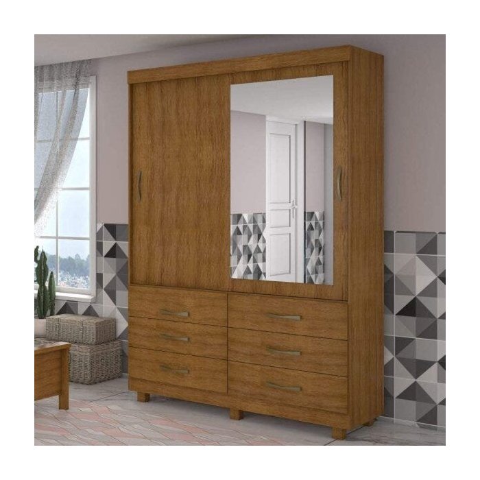 Guarda-Roupa Solteiro com Espelho 2 Portas de Correr 6 Gavetas Imbuia Turim Bianchi Móveis