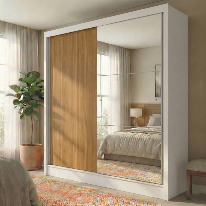 O Guarda-Roupa Solteiro Peônia é a solução ideal para quem busca organização e estilo em um só móvel. Com um design moderno que combina o tom amadeirado com a funcionalidade do espelho, ele otimiza o espaço do seu quarto graças às suas práticas portas de correr.