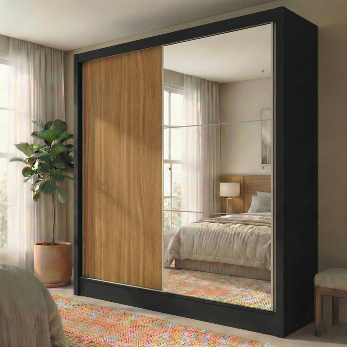 Guarda-Roupa Solteiro com Espelho 2 Portas de Correr e 2 Gavetas Peônia Yescasa Amêndola/Preto Prime TX