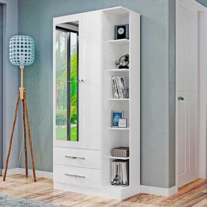 Guarda Roupa Solteiro com Espelho 2 Portas e Prateleiras Externas Moju Mapi Móveis - Branco