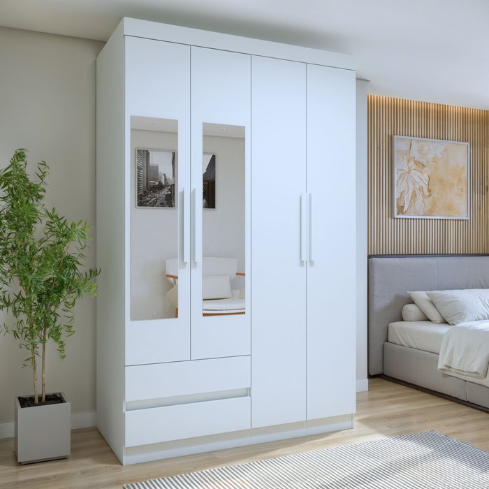 Guarda-Roupa Solteiro com Espelho 4 Portas 2 Gavetas Zeus Branco
