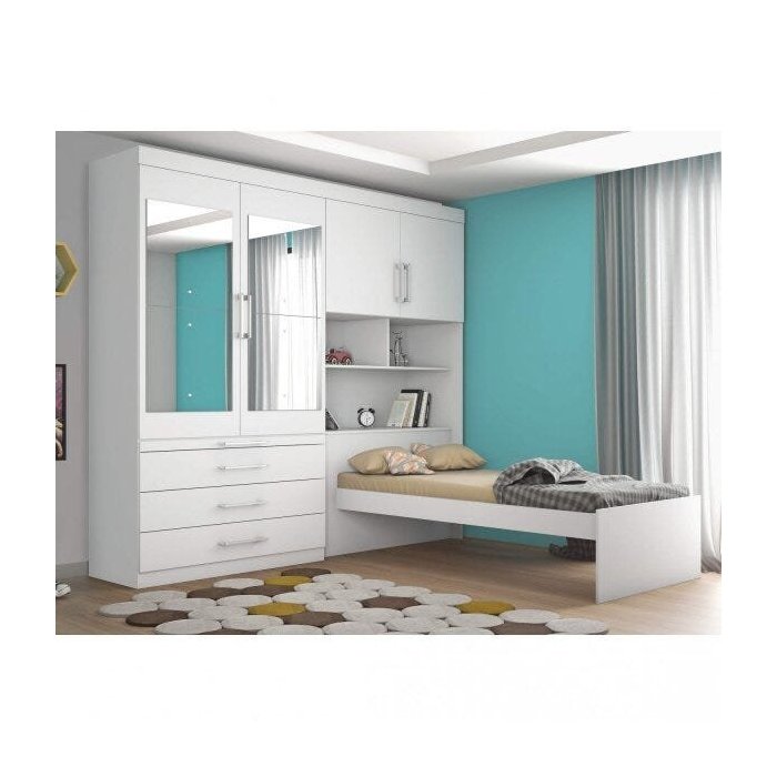Guarda-Roupa Solteiro com Espelho 4 Portas com Cama Baú Lyon e Mesa Retrátil Móveis Europa Branco