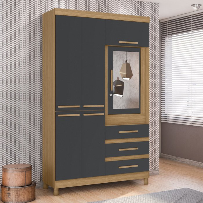 Guarda Roupa Solteiro com Espelho 6 Portas 3 Gavetas Fusion Nature/Titanium