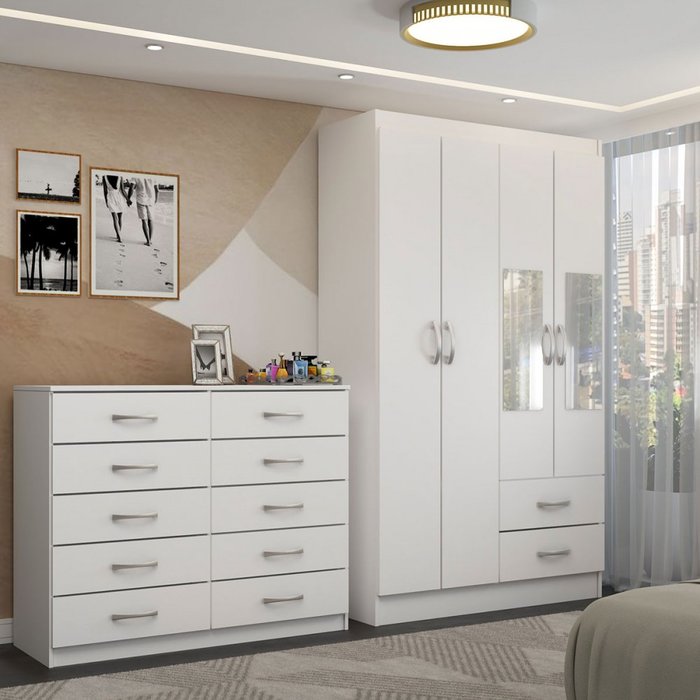 Guarda-roupa Solteiro Hazel 4 Portas 2 Gavetas e Espelho com Cômoda 10 Gavetas Branco - Panorama Móv