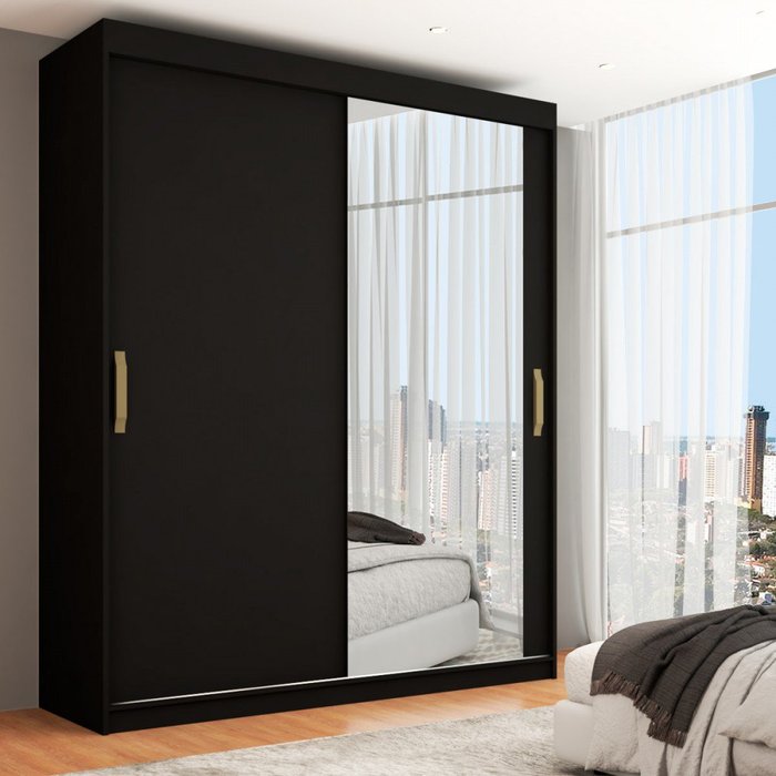 Guarda-Roupa Solteiro Istambul 2 Portas 2 Gavetas com Espelho Preto - Panorama Móveis Preto