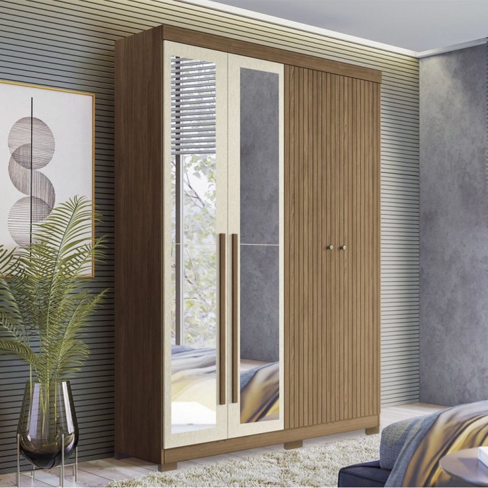 Guarda Roupa Solteiro Ripado 4 Portas 2 Gavetas Antony com Espelhos e Pés Jatobá/Areia