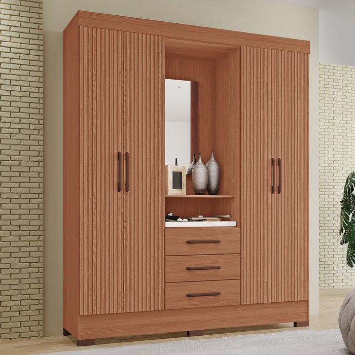Guarda Roupa solteiro Tuboarte Onix 100% MDF Capelinha 4 Portas e 3 Gavetas Kit de Espelho e Pés freijo rippas