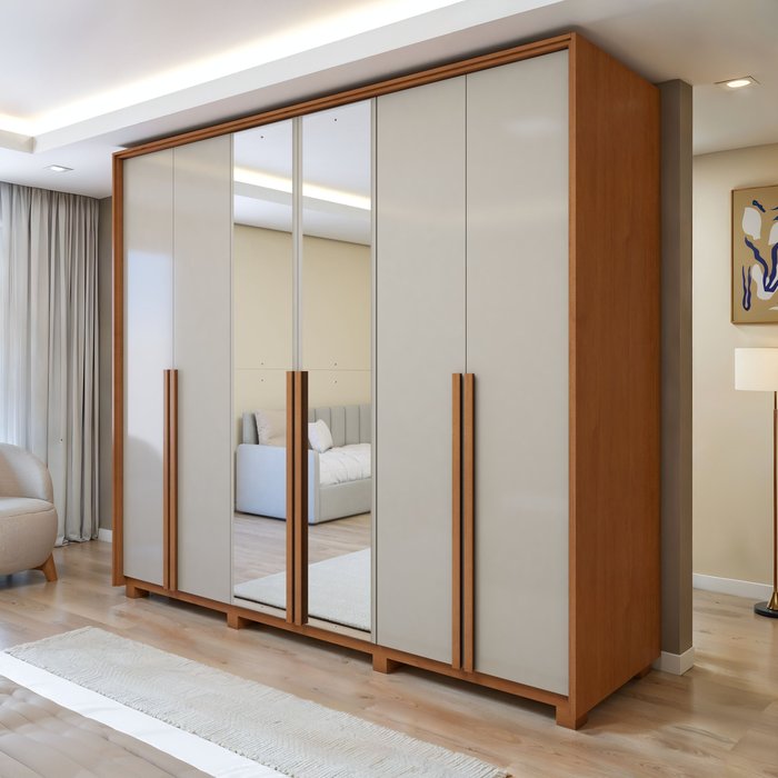 Guarda Roupa Style 6 Portas 4 Gavetas 100% Mdf com Espelho e Pés Amêndoa Clean/Off White