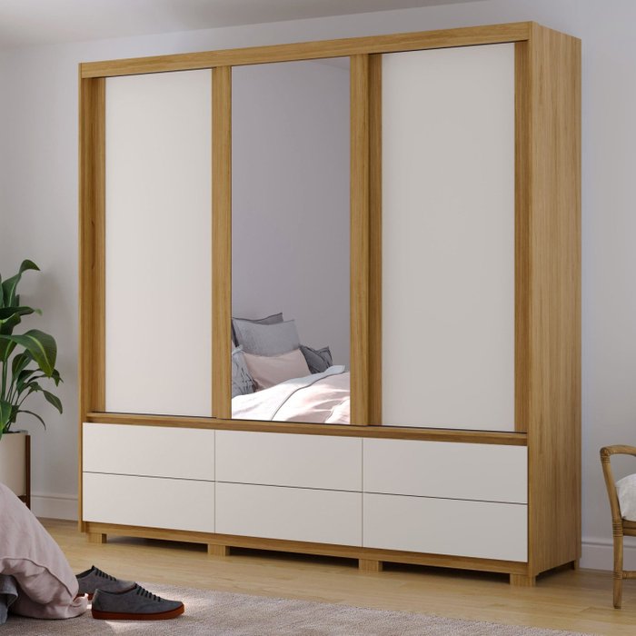 Guarda Roupas Casal 3 Portas de Correr 1 Espelho 6 Gavetas com Pés Malca