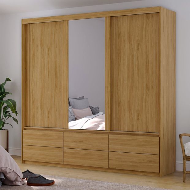 O Guarda-Roupa Malca, é ideal para seu espaço, ele pode ser facilmente combinado na sua decoração, pois possui um lindo design que se adapta a diversos estilos de móveis. Além disso, ele possui dois cabideiros, seis gavetas externas, três portas de correr com um espelho e uma colmeia central interna. Com pintura Ultravioleta de alta tecnologia e um lindo acabamento amadeirado, o produto ganha além de beleza, resistência e durabilidade. A estrutura é em MDP/MDF dando a segurança e rigidez que você precisa em um móvel deste porte.