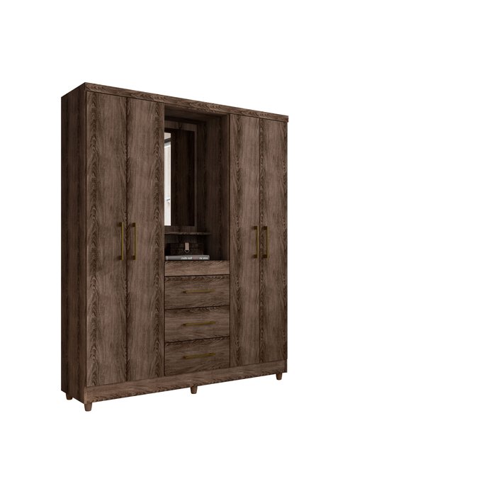 Estrutura do produto: MDP 12mm, 4 portas de bater, 3 gavetas externas com corrediças metálicas, 1 cabideiro de madeira revestido 47cm, 1 Espelho interno 668x400x3mm, 6 pés e 7 puxadores em alumínio.