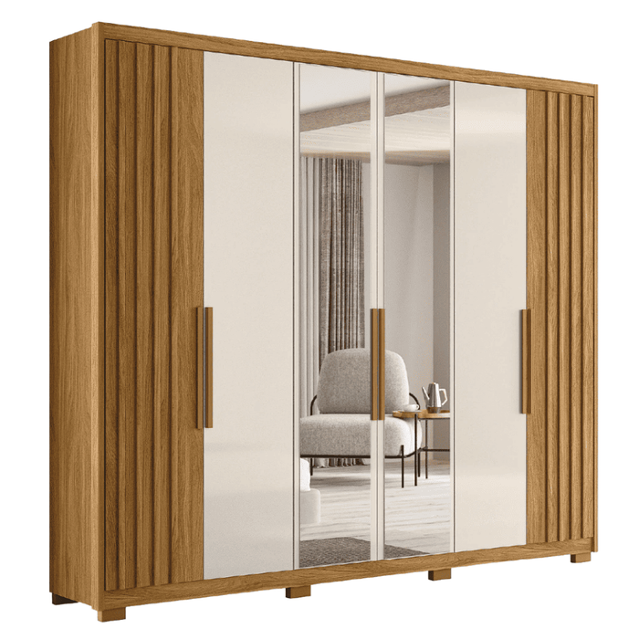 Guarda Roupas Casal Ripado com Espelho 6 Portas 4 Gavetas 2,60m Araguaia Freijó / Off White Moval
