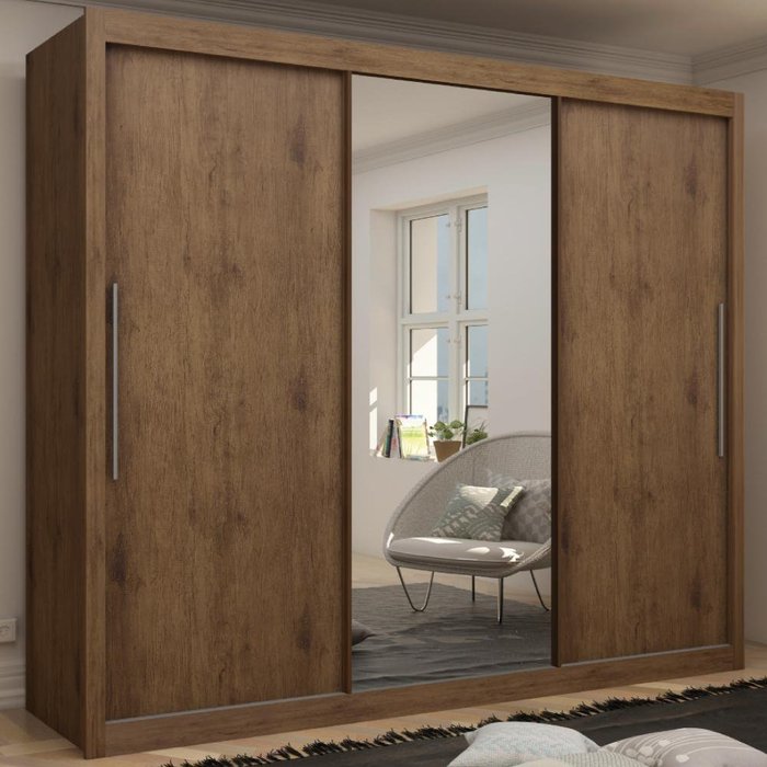 O Roupeiro Real se destaca pela praticidade das três portas de correr, que contribuem para a otimização de espaço, contando com um amplo espaço interno, onde sua estrutura é formada por quatro gavetas, 4 prateleiras e espaço para vestido e calças. O Roupeiro Real conta também com porta central de espelho trazendo mais sofisticação ao produto. O Roupeiro Real agrada pelo seu design compacto e arrojado.