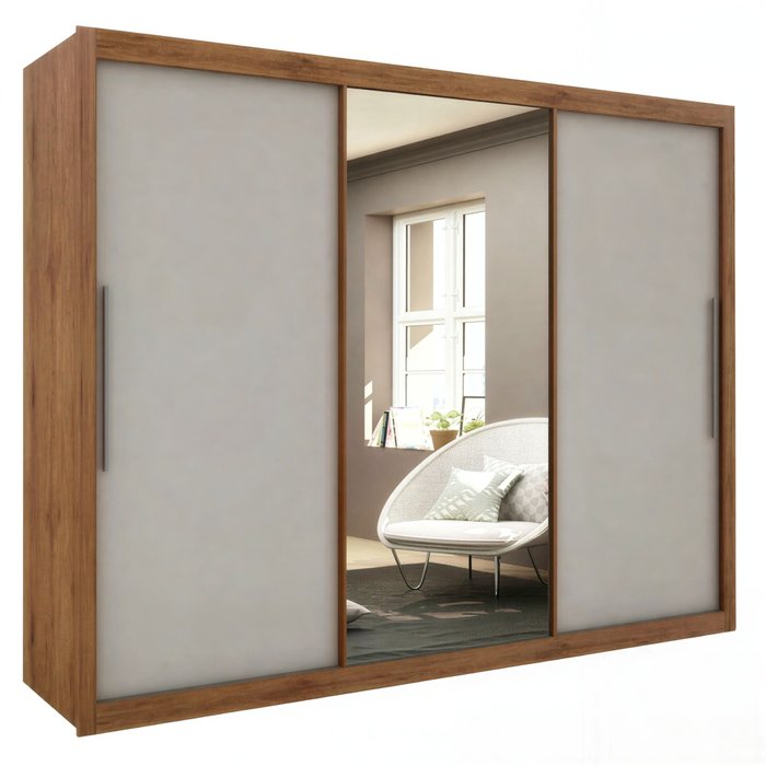 O Roupeiro Real se destaca pela praticidade das três portas de correr, que contribuem para a otimização de espaço, contando com um amplo espaço interno, onde sua estrutura é formada por quatro gavetas, 4 prateleiras e espaço para vestido e calças. O Roupeiro Real conta também com porta central de espelho trazendo mais sofisticação ao produto. O Roupeiro Real agrada pelo seu design compacto e arrojado.