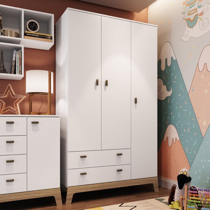 Projetado para otimizar o espaço, o guarda-roupas oferece ampla capacidade de armazenamento com suas três portas, duas gavetas espaçosas e prateleiras internas, facilitando a organização das roupinhas, fraldas e acessórios do dia a dia. O cabideiro incluso permite que as roupas fiquem penduradas de forma prática, evitando amassados e mantendo tudo ao alcance.