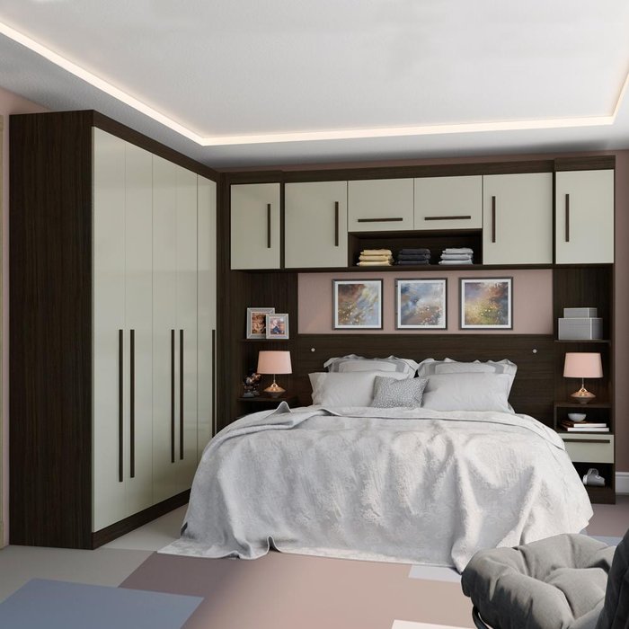 | ITENS INCLUÍDOS | 1 Módulo de Guarda Roupas com 4 Portas, 1 Módulo de Canto, 2 Mesa Auxiliar de Cabeceira, 1 Painel de Cabeceira, 1 Ponte Aérea de 1,80m |