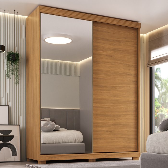 Guarda Roupas Solteiro 100% MDF 2 Portas de Correr Espelho 3 Gavetas com Pés Natale