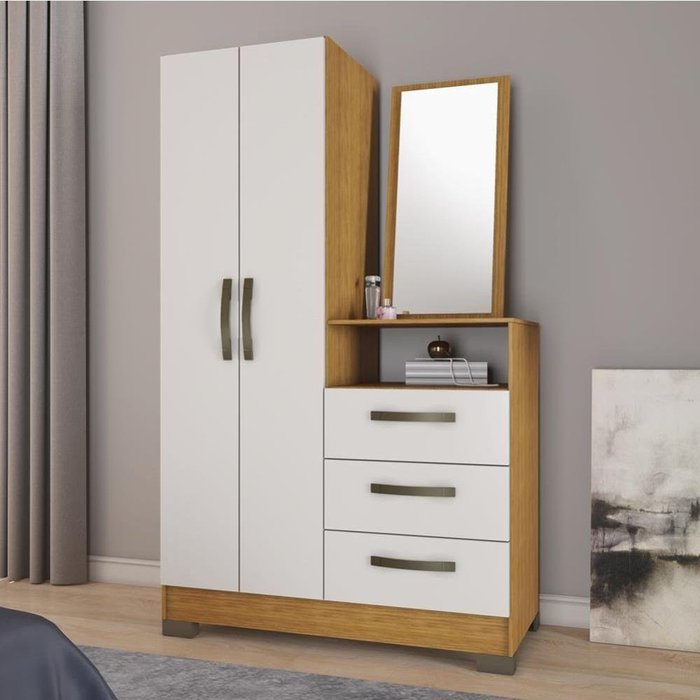 Guarda Roupas Solteiro Com Cômoda Espelho 2 Portas 3 Gavetas Melina Nt 5165 Freijó / Off Whitenotáve Off White