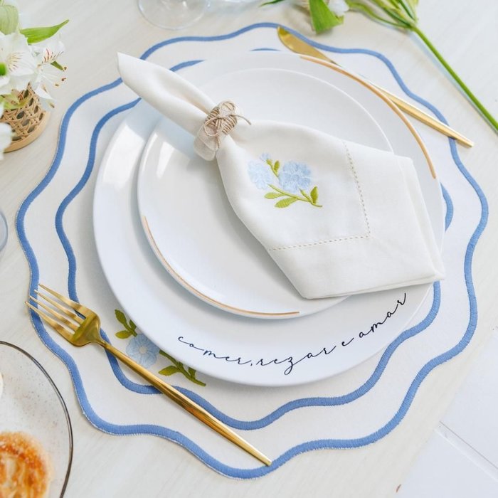 O Guardanapo Flor Azul Claro é delicadamente bordado com uma flor de tom suave que transmite tranquilidade e sofisticação para a mesa posta. Seu tecido leve e acabamento cuidadoso combinam com diferentes estilos de louça e decoração, trazendo charme e harmonia à composição. Ideal para usar no dia a dia com elegância, em ocasiões especiais ou até mesmo para presentear Cor/Estampa: Branco.