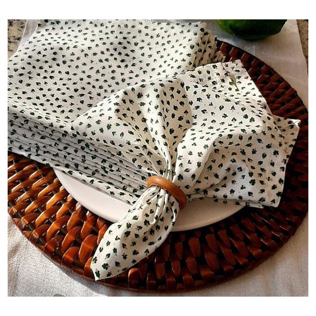Pack com 02 guardanapos de estampa delicada em tons de verde e fundo marfim, acabamento com barra canto mitrado.