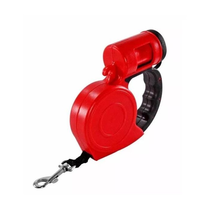 Guia retrátil com trava para facilitar a segurança de seu animal quando for passear com 20 saquinhos para recolher a sujeira de seu animal. muito prático e fácil de usar.