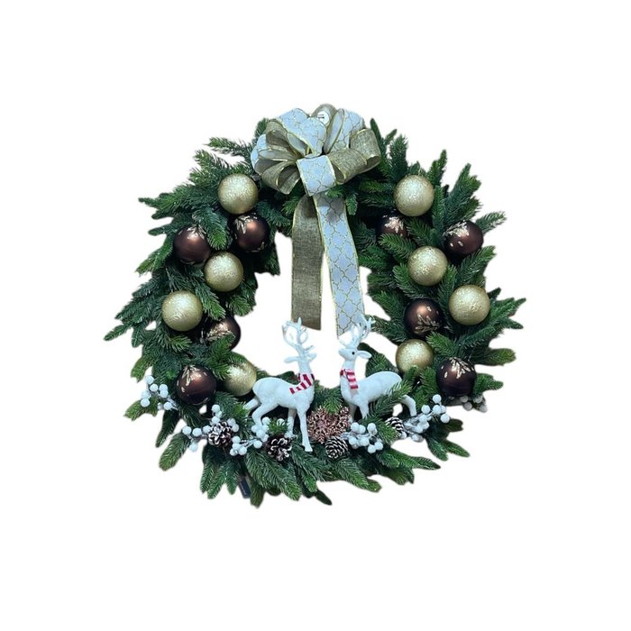 Guirlanda decorada na cor Douradp 195 galhos para um visual cheio e volumoso Luzes LED integradas, baixo consumo de energia Medida aproximada: 90cm de diâmetro Ideal para portas, salas, halls de entrada e festas