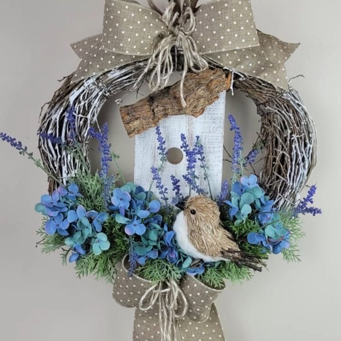 Material: Base em cipó tratado com pintura em branco, casinha de passarinho rústica, passarinho de palha, lavandas, hortências e verdes claros, laço em bege com poá branco aramado e laço de algodão.