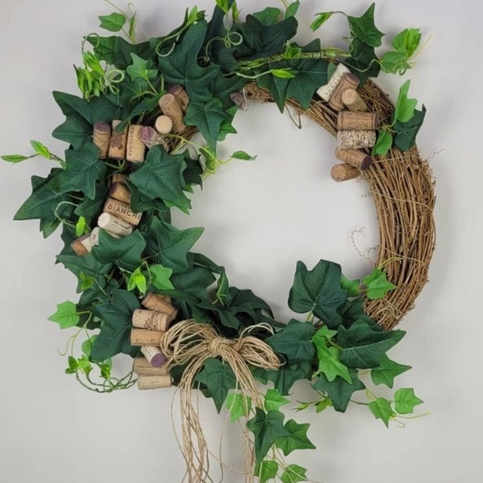 Material: Base em cipó tratado, heras e verdes variados, rolhas de vinho e laço de sisal.