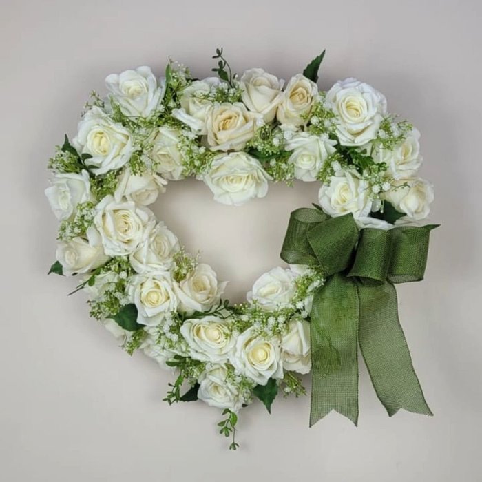 Baseada em um delicado formato de coração, esta guirlanda mede 60x55 cm e é forrada com rosas brancas artificiais, cuidadosamente dispostas para criar um visual harmonioso e elegante. Pequenas flores brancas artificiais e folhagens verde-claras complementam o design, trazendo frescor e suavidade. Um laço verde aramado adorna a guirlanda, adicionando um toque refinado e sofisticado, perfeito para decorar ambientes com charme e leveza. Ideal para ocasiões especiais, como casamentos, ou para dar um toque acolhedor e romântico a qualquer espaço.