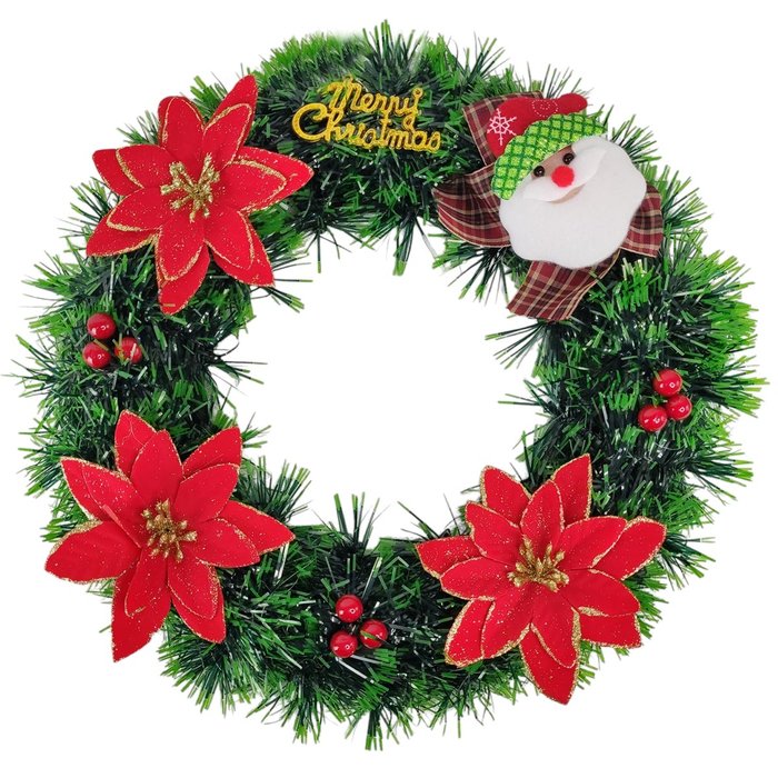 Guirlanda com detalhes com laço de tecido vermelho, papai Noel e flores decorativas dão um charme na sua decoraçao. Aproveite o clima natalino e decore a sua casa.