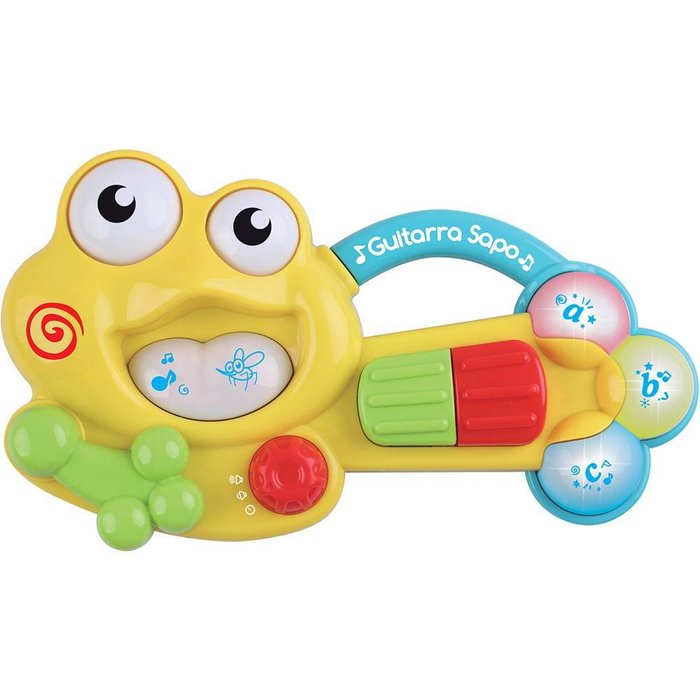 As crianças vão adorar a Guitarra Sapo da Dican, um brinquedo muito divertido e que vai auxiliar no desenvolvimento auditivo e visual do pequeno Leve para casa essa guitarra e permita que seu filho se sinta um verdadeiro astro do rock Com um design moderno, cores vibrantes, controle de volume, alças para carregar e emissão de sons e luzes, seu filho vai adorar