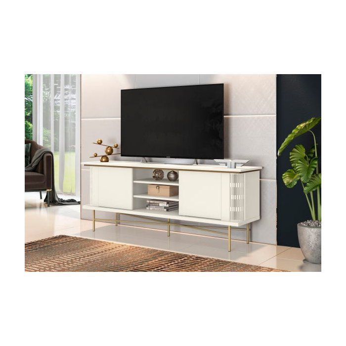 Ficha Técnica:Dimensão do Produto:Largura: 160cmAltura: 61,5cmProfundidade: 38,3cmEstrutura: MDP/MDF;Acabamento: Pintura UV, Texturizado reproduzindo os veios da madeira natural;Pés: Metal com pintura epóxi eletrostática de alta resistência anti oxidante na cor dourado gold;Tampo Duplo: 15mm cada;Base: 25mm;Suporta TV de até: ?? polegadas;Quantidade de Portas: 02 portas com dobradiças metálicas;Quantidade de Prateleira: 02 prateleiras removíveis;Diferenciais:Recortes a laser em curva nas laterais;Nichos para aparelhos;Detalhe sob tampo principal; Peso Bruto do Produto Embalado: 38,5kg