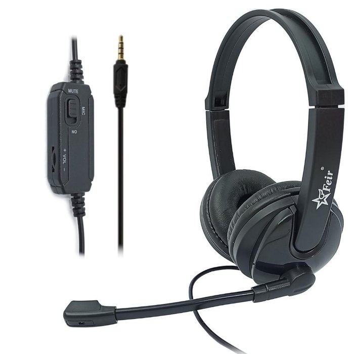 - headset fone com microfone, plug p3 3.5mm, controle de volume e mute no cabo.