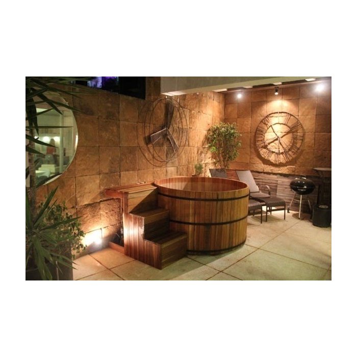 Tradicionalmente confeccionado em madeira. E aqui no Brasil, o tipo mais usado é de cedro rosa, que é uma madeira que deixa a água quentinha por mais tempo, além de ter um toque aveludado na pele, e um aroma agradável e relaxante.