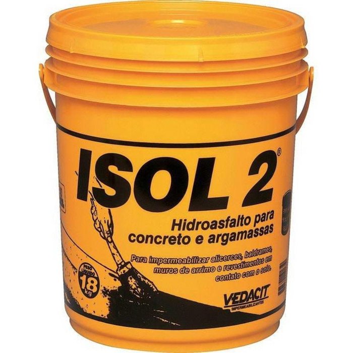 Hidroasfalto Líquido Vedacit Isol 2, 18 Kg O Hidroasfalto ISOL 2 forma sobre as superfícies uma película elástica e impermeável, resistente a água e aos meios agressivos, podendo ser aplicado sobre superfícies úmidas. ISOL 2 é indicado para proteção de estruturas de concreto e alvenaria em geral. Características Marca: Vedacit Modelo: Isol 2 Tipo: Líquido Especificações: 1 g/cm de densidade Aparência líquida viscosa de cor marrom Composição básica - emulsão asfáltica Campos de Aplicação: Muros de arrimo Alicerces Revestimentos em contato com o solo Peso: 18 Kg Garantia: 24 meses