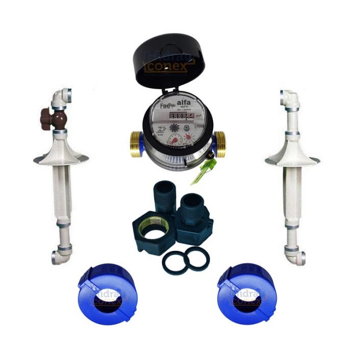 Hidrômetro Unijato 1/2" x 115mm Vazão Mínima 30l/h Vazão Nominal de 1,5m³/h Vazão Máxima de 3,0m³/h Classe B Relojoaria 45º com Conexões + Kit Cavalete PVC Tigre.