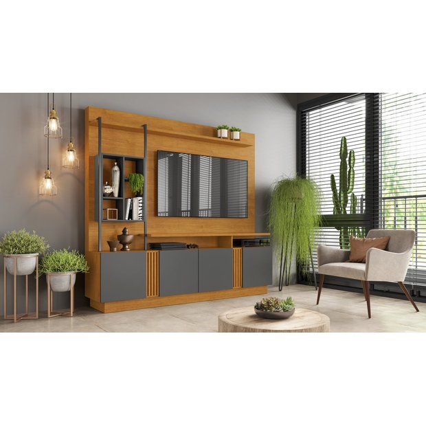 Possui nichos decorativos e prateleiras, ideais para colocar os eletronicos, proporcionando ao ambiente um ar mais harmonico.