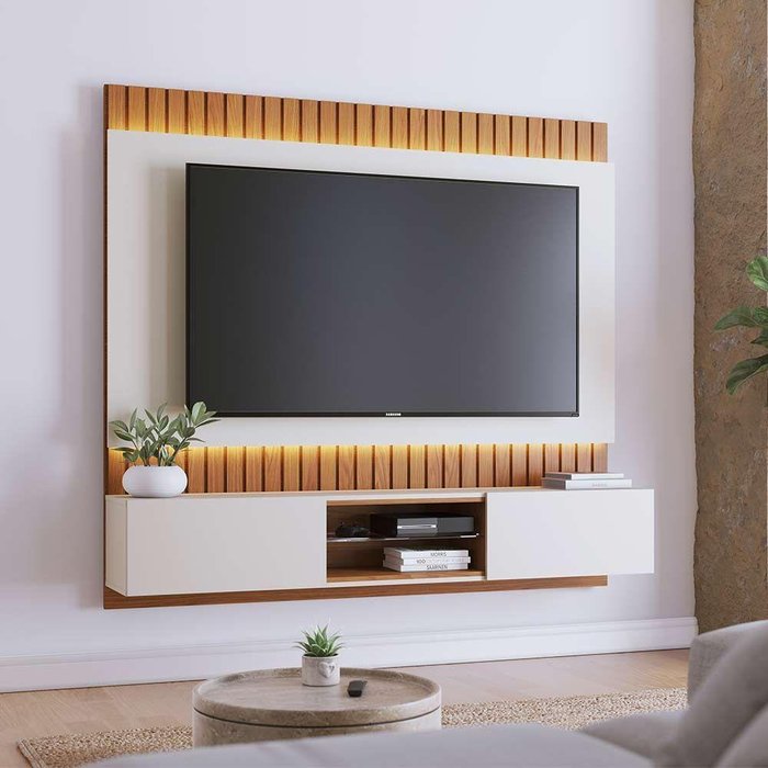 Inspirado no design contemporâneo, o home Suspenso Búzios é ideal para quem quer renovar com requinte e sofisticação a decoração da sala de TV e home cinemas. Possui opções de suporte para TVs até 75 polegadas, transformando qualquer sala de TV em um verdadeiro cinema em casa. Super charmoso, possui um painel todo ripado com iluminação de led em toda a sua extensão, que ao refletirem proporcionam uma ambientação intimista e aconchegante para a sua sala. Além disso, possui duas portas basculantes laterais com pistão a gás e dois nichos com uma prateleira de vidro para acomodar aparelhos eletrônicos e objetos decorativos de maneira prática e organizada.Dimensões do Produto: