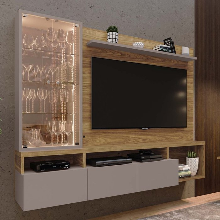 O Home para TV Joinville é perfeito para deixar a sua casa ainda mais completa e bonita ! Ele possui atributos sofisticados de alto padrão, cristaleira espelhada e fita de LED com efeito infinito em seu interior, além de ter um efeito estético deslumbrante as portas da cristaleira são em vidro reflecta com puxadores em metal cromado. O home conta com cores e veios de madeira exclusivos e acabamento de qualidade com volumetria 3D, que são diferenciais do produto.