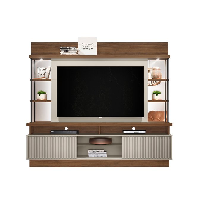 O Home Salvador é perfeito para deixar sua sala elegante e sofisticada. Produto simétrico, para TV de até 60 polegadas, conta com duas portas deslizantes com detalhes no ripado proporcionando otimização de espaço. Moderno e com design industrial, conta com espaços para acomodar aparelhos eletrônicos e ainda dois nichos com luminárias de LED para acomodar suas decorações preferidas. Com 2,18 m de largura o painel Home Salvador é ideal para você que busca requinte sem abrir mão da funcionalidade.Características: Porta de correr ripada Espelho + luminaria de led Tampo de 37mm Haste de MDF revestida 4 Nichos 2 Portas 6 Prateleiras Espelho kit lumináriaDimensões: Altura: 191 cm Largura: 218 cm Profundidade: 40 cm Peso: 110,78 kgGarantia do fornecedor de 3 meses.