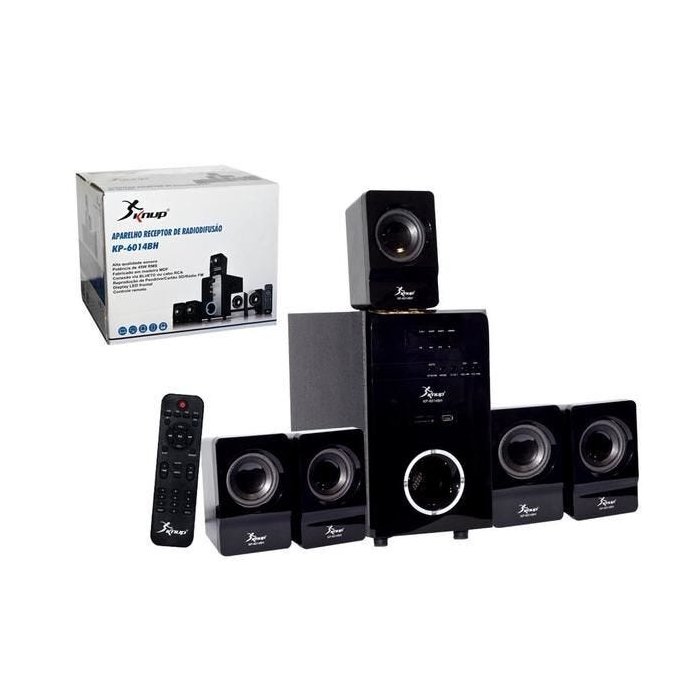 APARELHO DE SOM 5.1 KP BH 6014 Desfrute de alta qualidade de som e potência em seus entretenimentos com o KP-6014BH. Conecte o aparelho de DVD, a TV, o PC, SmartPhone e aproveite todos os sons com alta qualidade e clareza. O sofisticado circuito conta com agudo claro e intenso, baixo poderoso e extrema potência. Tudo isso para você aproveitar sempre do melhor som. E mais! Conecte seu dispositivo USB ou Cartão SD e ouça os seus melhores conteúdos. Especificações Técnicas: - Potência: 45W RMS (20W sub + 5 x 5W Satelites) - Alimentação: 110 ~ 220 V - Frequência de resposta: 40Hz ~20KHz - Sensibilidade: 75dB + 50 dB - Impedância: 8 Ohms - Conexão: Bluetooth - Entrada: USB, SD Card, RCA - Rádio: FM - Display LED frontal Conteudo: 1 Caixa de som subwoofer 5 Caixa de som satélites 1 Cabo de Áudio 1 Controle remoto 1 Antena FM 1 Manual de intruções