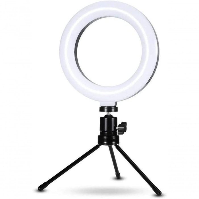 Iluminador Mini Ring Light Com Tripé Maquiagem 6 PolegadasO Iluminador de LED Ring Ligth portátil indicado para quem busca ampliar a iluminação de suas fotos e vídeos.Utilize a ring light de mesa para tirar selfies de alta fidelidade de cores e tons.Este iluminador amplia a iluminação do ambiente e é o item mais procurado e utilizado por profissionais e entusiastas dos mais diversos ramos e atividades, como esteticistas, fotógrafos, vídeo makers, youtubers.Utilize os ajustes de intensidade e tonalidade de cor para criar efeitos de iluminação e filtros práticos sem a necessidade de aplicativos ou editores de imagem.Leve e prático para o transporte, essa ring light é ideal para quem gosta de estar preparado em qualquer situação.O iluminador acompanha um controle multifunção e um tripé de mesa, sua iluminação é de LED e o tripé possui um suporte que rotaciona em 360 graus.INFORMAÇÕES TÉCNICAS:Intensidade de luz regulável.Sistema embutido regulador de cor: Fria, Média e Quente.Força total: 18W. Alimentação: USB 2A 5W/18W.Temperatura de cor: 3200k - 5500K ajustável Ângulo Regulável: Sim Potência: 10w Dimensões: 6 polegadas.Comprimento do cabo: 170cm.Comprimento do tripé: 13cm.Controle multifuncional acoplado.Incluso tripé rotacional.Cor do Tripé: PretoDiâmetro : 16 cmAlimentação: 5v USBComprimento aproximado do cabo: 1,90mItens Inclusos: 01 -Iluminador Circular 01- Mini Ballhead 01- Mini Tripé Rotacional