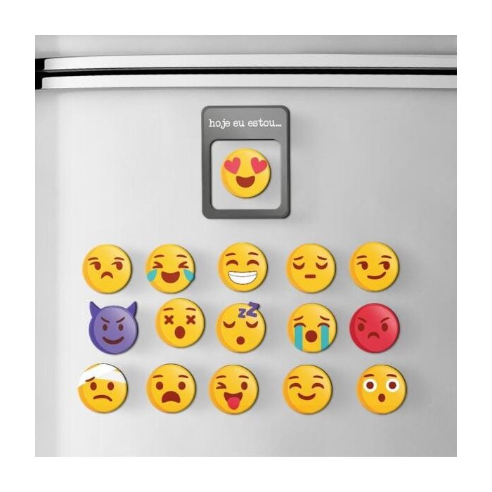 CONTEÚDO: 1 Conjunto de Ímãs Humor do Dia, contendo 1 moldura (7x9 cm) e 16 emojis (4x4 cm cada).