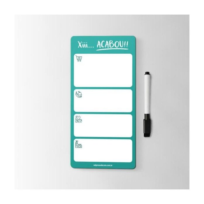Com design divertido, o ímã para geladeira "Xiii... Acabou!!” é uma forma prática de criar sua lista de compras, ajudando você a não esquecer de comprar aquele produto super importante que está faltando em casa. Ideal para ser fixado sobre superfícies metálicas como geladeira, memory-board, etc.