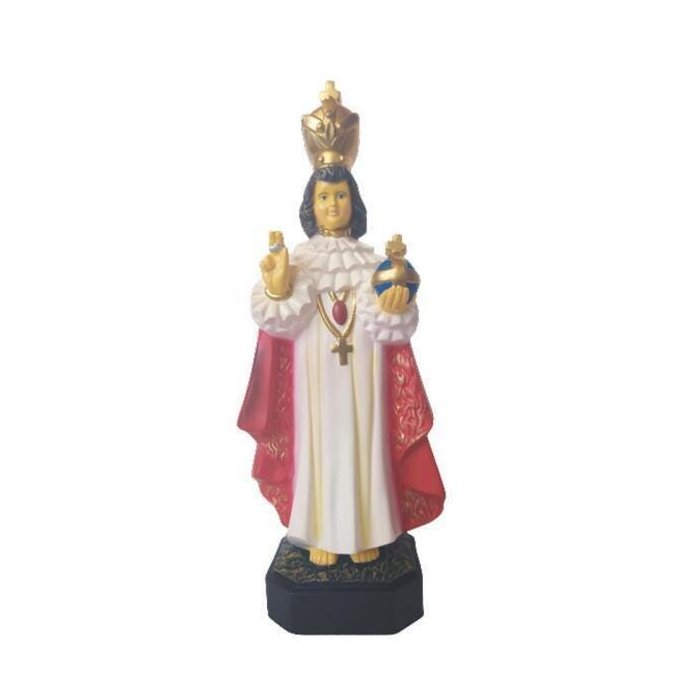 Imagem de menino jesus de praga Altura 30 cm Largura 10 cm Comprimento 8 cm Confeccionada em gesso Produto novo Colorido A imagem original do menino jesus de praga está na igreja de nossa senhora vitoriosa, na cidade de praga, na atual república tcheca. A tradição diz que esta devoção começou em conventos carmelitas da espanha e que santa tereza d'ávila foi quem confeccionou suas roupas de rei. Santa tereza teria dado a imagem à princesa polixene. Esta, mais tarde, casou-se com um nobre tcheco e a levou para o país de seu noivo. Antes de falecer, já idosa, polixene doou a imagem aos carmelitas de praga. A imagem foi perdida em guerras e invasões protestantes, e achada milagrosamente nos escombros da igreja após vários anos. Daí em diante a devoção recomeçou e nunca mais parou. Milhares de graças e milagres são atribuídos ao menino jesus de praga. Vamos conhecer os símbolos de sua imagem. A coroa do menino jesus de praga A coroa do menino jesus de praga simboliza sua realeza. Este menino é o rei do universo, de forma que 'todas as coisas foram criadas por ele e para ele' (joão 1, 3) o simbolismo da criança é profundo. O verdadeiro rei do universo se faz humilde, indefeso e simples como uma criança para nos ensinar que nós também devemos seguir este caminho se quisermos ser felizes. A cruz no corpo do menino jesus de praga A cruz no corpo do menino jesus de praga anuncia o sofrimento e a morte que ele vai sofrer quando adulto, pela salvação da humanidade. Ela está relacionada e ligada ao manto vermelho do menino rei. O manto vermelho do menino jesus de praga O manto vermelho do menino jesus de praga simboliza o sangue, a paixão de cristo e está intimamente ligado à cruz. Os desenhos em dourado aplicados ao manto simbolizam a divindade e o amor deste menino. Estes símbolos nos falam que ele vai se entregar por amor, mesmo sendo divino, vai sofrer por cada um de nós. A túnica branca do menino jesus de praga A túnica branca do menino jesus de praga simboliza sua pureza. Ele é o rei do universo, é divino, é humilde, indefeso como uma criança e é puro. Puro quer dizer sem impurezas, sem mistura, sem alteração, limpo, inocente, sem má intenção, sem intenção oculta, verdadeiro, transparente. A mão esquerda segurando o mundo A mão esquerda do menino jesus de praga segurando o mundo significa que o amor e o poder deste menino é que fazem o mundo existir e continuar existindo. Jesus tem o mundo em sua mão. A mão esquerda é a mão do apoio, da sustentação, da preservação. Assim, este símbolo nos diz que jesus sustenta o mundo. A mão direita abençoando A mão direita do menino jesus de praga também tem um significado profundo. A mão direita é a mão da ação, do agir, do 'verbo'. Ele é o 'verbo de deus', ou seja, é deus agindo. E qual a ação que esta mão direita realiza' abençoar derramar bênçãos sobre o mundo que ele sustenta em sua mão esquerda. Jesus, na verdade, é a própria bênção de deus. Recebê-lo em nossa vida é a maior de todas as bênçãos que podemos ter. Oração ao menino jesus de praga 'ó menino jesus, a vós recorro e a vós suplico pela intercessão de vossa santíssima mãe, assisti-me nesta necessidade, (pedir a graça), porque creio firmemente que vossa divindade pode me socorrer. Espero com toda confiança obter vossa santa graça. Amo-vos de todo o meu coração e com todas as forças da minha alma. Arrependo-me sinceramente de todos os meus pecados, e vos imploro, ó bom jesus, que me fortaleça para que eu possa ser vitorioso. Proponho-me a não vos ofender e me ofereço a vós, dispondo-me a sofrer, antes de vos fazer sofrer. Doravante, quero servir-vos com toda fidelidade, e por vosso amor, ó menino deus, amarei o meu próximo como a mim mesmo. Menino onipotente, senhor jesus, mais uma vez vos suplico que me atenda nesta necessidade. Concedei-me a graça de vos possuir eternamente, na companhia de maria santíssima e são josé, para que possa vos adorar com todos os anjos na corte celestial. Amém.'