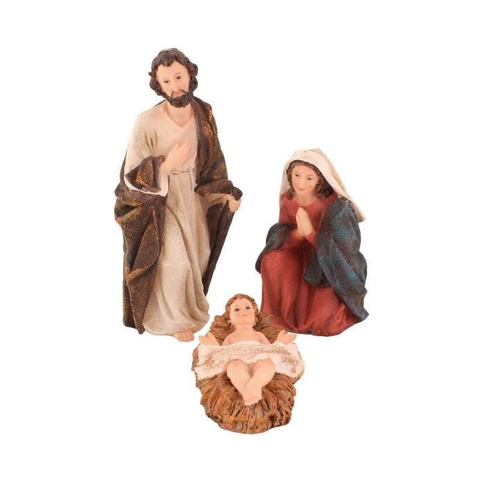 Enfeite decorativo em forma de Presépio com cores reais. Acompanha as peças de José, Maria e o Menino Jesus. A figura maior possui 22 cm de altura.